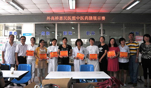 下午1:30,主持人一声令下,12支参赛队抽签后按号选挑1种主料、3种辅料(药材、水果不限),并为本队参赛的1个炒菜、1个甜品起菜名。接着,比赛正式开始。只见各队参赛者操作熟练,刀起刀落、游刃有余,不一会儿,各色美食已在锅内烧煮,顿时香飘四溢……半小时后,一道道色香味型俱全的药膳菜肴新鲜出炉,菜名既具特色又富有诗情画意:五彩鱼羹、花好月圆、锦绣前程、瑞雪兆丰年……每一道都是精心摆盘雕琢、独具个人创意,制作者还介绍了这道菜所选用的药材,有何功效等。评委们品尝后再根据保健功能、制作卫生、色泽形态、味道质感等各项评分标准一一打分。结果,七院医技分工会队的“锦绣前程”、临四分工会队的“粉蒸牛肉”荣获“七院队”冠、亚军;高东社区队的“松仁鱼米”、凌桥社区队的“陈皮虾”荣获“社区队”冠、亚军。姚红刚部长、陈宝忠处长、郁铭中副主任、孙非书记及王山书记给参赛队颁奖并与大家合影留念。