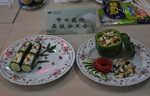 2014年9月5日下午,在市七医院职工食堂举办了“外高桥惠民医盟中医药膳展示赛”。浦东新区总工会姚红刚部长,区卫计委组织人事处处长陈宝忠,新区医务工会副主任郁铭中,新区卫计委团委书记孙非及七院党委书记王山、工会副主席黄秀芝,高桥、高东、高行、凌桥社区卫生中心的四位党支部书记等出席比赛并担任评委,七院健康管理部主任张彤担任主持人,来自七院和四个社区卫生中心的8支代表队参加了比赛。