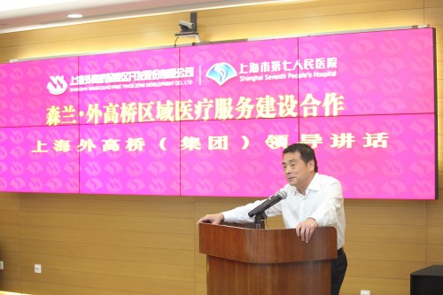 上海市第七人民医院院长王杰宁首先介绍了合作项目背景情况。接下来,上海外高桥保税区开发股份有限公司总经理施伟民与上海市第七人民医院院长王杰宁签署合作协议。然后上海外高桥(集团)有限公司党委书记、总经理舒榕斌讲话,他说:“森兰·外高桥区域医疗服务平台非常好,很高兴我们能和上海市第七人民医院合作,为森兰、为自贸区的民众创造良好的医疗服务健康保障体系。我相信我们和上海市第七人民医院的合作一定能为森兰为自贸区带来新的医疗服务体验!”