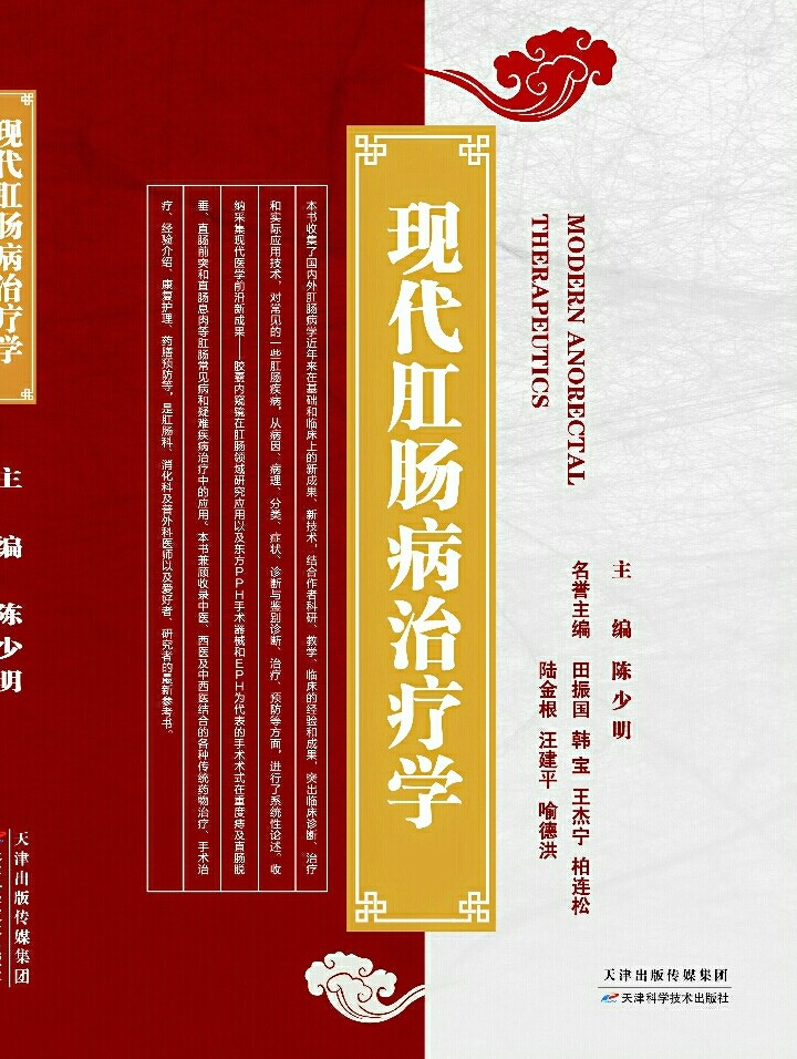 由我院肛肠科主任陈少明担任主编,中华中医药学会肛肠分会会长田振国教授、我院王杰宁院长担任名誉主编,我院护理部主任严斌泓任副主编,十余位临床专家医师参加编撰;顾玉东、吴咸中院士作序,国家一级出版社天津科学技术出版社出版的《现代肛肠病治疗学》一书于金秋十月正式出版。并于2014年10月17日在成都召开的中华中医药学会肛肠学术年会上首次发行。
