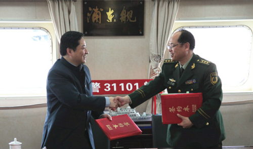庄重的签约仪式在海警31101舰(浦东舰)上举行,海警总队筹备组副组长张德标主持了仪式,海警总队各位领导及市七医院院领导一行参加了仪式。