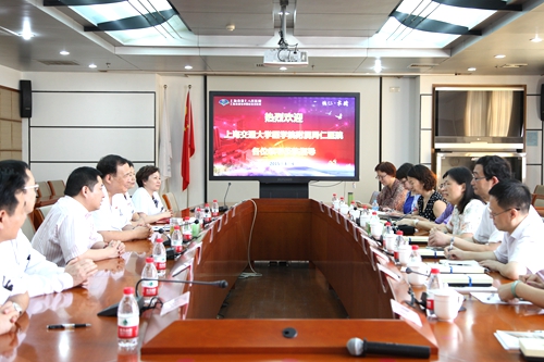 2015年8月6日,上海交通大学医学院附属同仁医院院长马俊、党委书记蔡家麟、副院长蒋利、郑涛、杨军等领导一行9人来我院交流学习。我院院长王杰宁、党委书记徐玉英,副院长王澎、刁枢、周一心、林研,医务处处长陆志成等相关领导出席了交流会议。