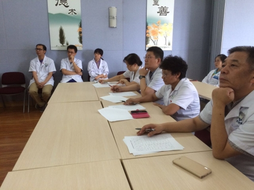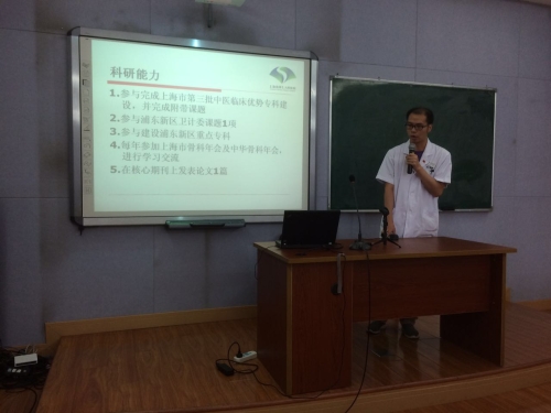 我院为了让更多的优秀青年医师得到全方位的锻炼,认真做好培养人选的推荐工作,于2015年8月19日星期三下午1:30分在行政五楼示教室进行了“青年医师培养资助申报对象选拔”擂台赛;评委由传统医学科主任叶玉妹、男性病科主任孙建明、肛肠科主任常忠生、人事处长林鸣芳组成;申报候选人共计六人,他们分别从专业素养、专业技能、科研能力、文章发表、英语能力、导师情况、培养计划等方面进行了汇报。