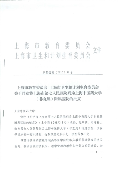 2015年8月31日我院取得沪教委高【2015】38号《上海市教育委员会、上海市卫生和计划生育委员会关于同意将上海市第七人民医院列为上海中医药大学(非直属)附属医院的批复》。