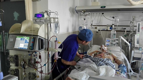 由于病人血管畸形,血透管置管工作困难重重,姚玉龙医生当机立断,利用B超机进行了超声引导下的血透置管,置管终于成功!护士袁维方刚刚在介入科做完一个严重肝功能不全患者的人工肝治疗,主动要求加班,对这名危重患者进行床旁血液净化治疗。